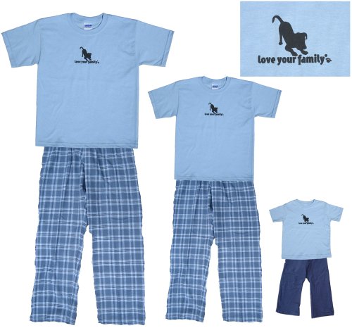 Great Gift for Dog Lovers! If your dog is as much a part of your family as anyone, our Love Your Family Dog tees in adult, kids and baby sizes are perfect!Jersey tees are 100% cotton pre-shrunk fabric with double-stitched seamless collar, taped neck and shoulders. Unisex sizing. Infant tees are a slightly lighter blue than the adults and youth and combed extra for softness; 3 snap neck closureADULT/Yth S-M: pants are blue/white print 100% cotton flannel; 4 oz. lightweight; elastic waistband. Unisex sizing.Toddler/Infant: set comes with 100% baby-rib coordinating solid Navy pants. (Childrens sets are designed as playwear and Not intended as sleepwear: for child's safety, garment should fit snugly. This garment is not flame resistant; loose fitting garment is more likely to catch fire.) ** Each Item Sold and Priced Separately - Please add items to your shopping cart separately